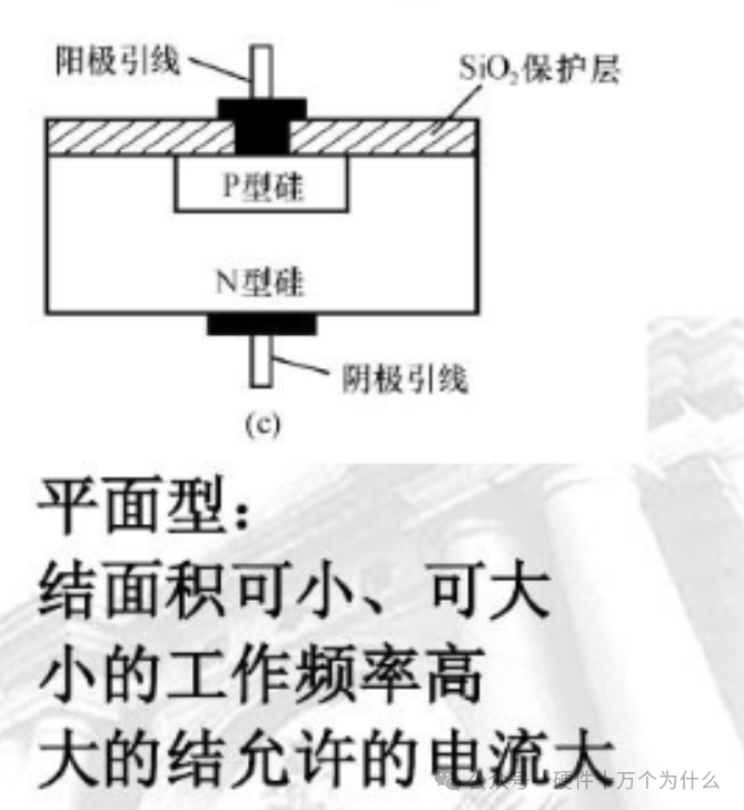平⾯型⼆极管在半导体单晶⽚(主要地是N型硅单晶⽚)上,扩散P型杂质,利⽤硅⽚表⾯氧化膜的屏蔽作⽤,在N型硅单晶⽚上仅选择性地扩散⼀部分⽽形成的PN结。因此,不需要为调整PN结⾯积的药品腐蚀作⽤。由于半导体表⾯被制作得平整,故⽽得名。并且,PN结合的表⾯,因被氧化膜覆盖,所以公认为是稳定性好和寿命⻓的类型。最初,对于被使⽤的半导体材料是采⽤外延法形成的,故⼜把平⾯型称为外延平⾯型。对平⾯型⼆极管⽽⾔,似乎使⽤于⼤电流整流⽤的型号很少,⽽作⼩电流开关⽤的型号则很多。