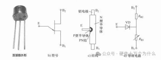 双基极二极管的制作过程:在一块高电阻率的N型半导体基片的两端各引出一个铝电极,如图c所示,分别称为第一基极B1和第二基极B2,然后在N型半导体基片一侧埋入P型半导体,在两种半导体的结合部位就形成了一个PN结,再在P型半导体端引出一个电极,称为发射极E。