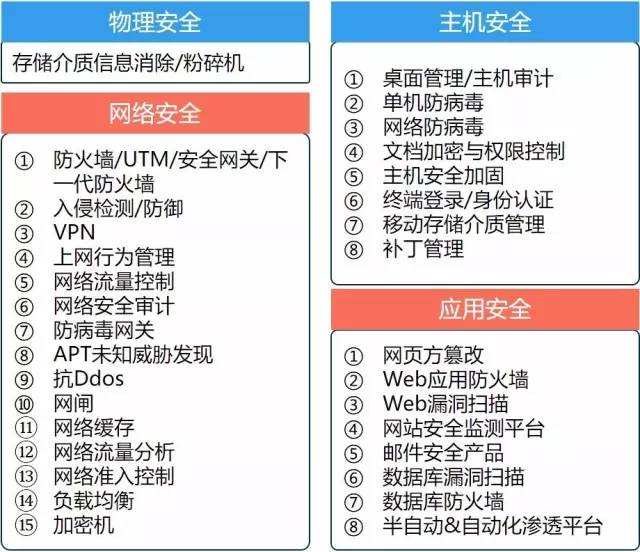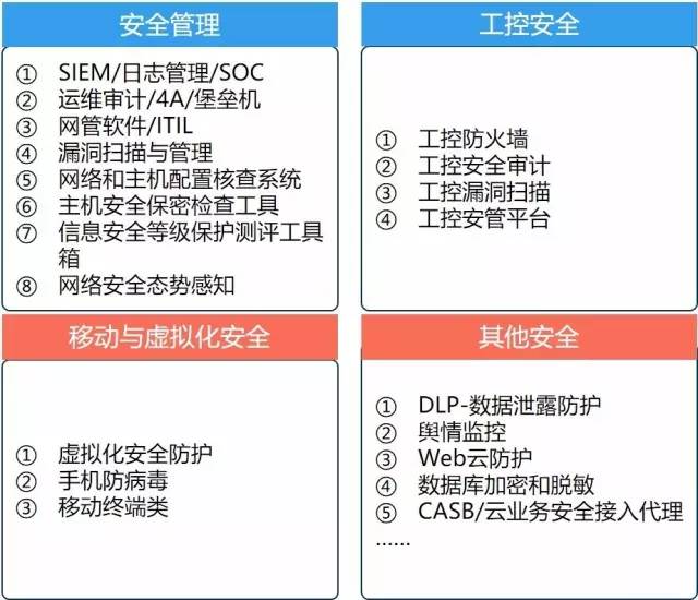 基础设施安全类、终端安全、数据安全、应用安全、身份与访问管理、云安全、移动安全、网络空间安全、业务安全、工控安全、安全管理、安全服务。