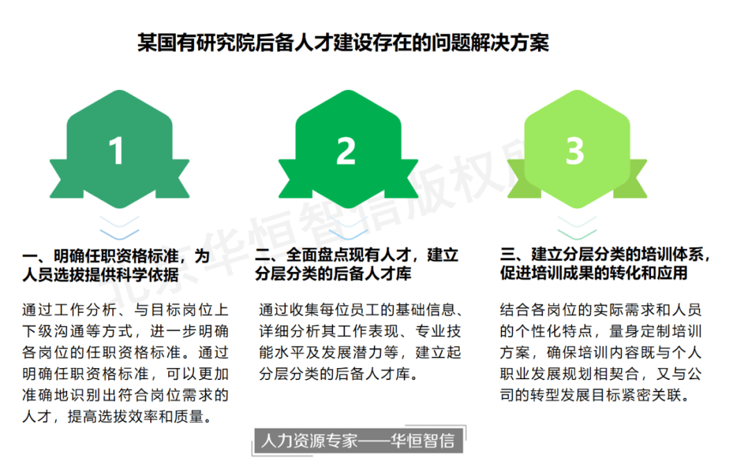 针对上述问题,华恒智信提出,明确任职资格标准,为人员选拔提供科学依据;全面盘点现有人才,建立分层分类的后备人才库;建立培训效果评估机制,促进培训成果的转化和应用,为企业的持续发展提供有力的人才支持。